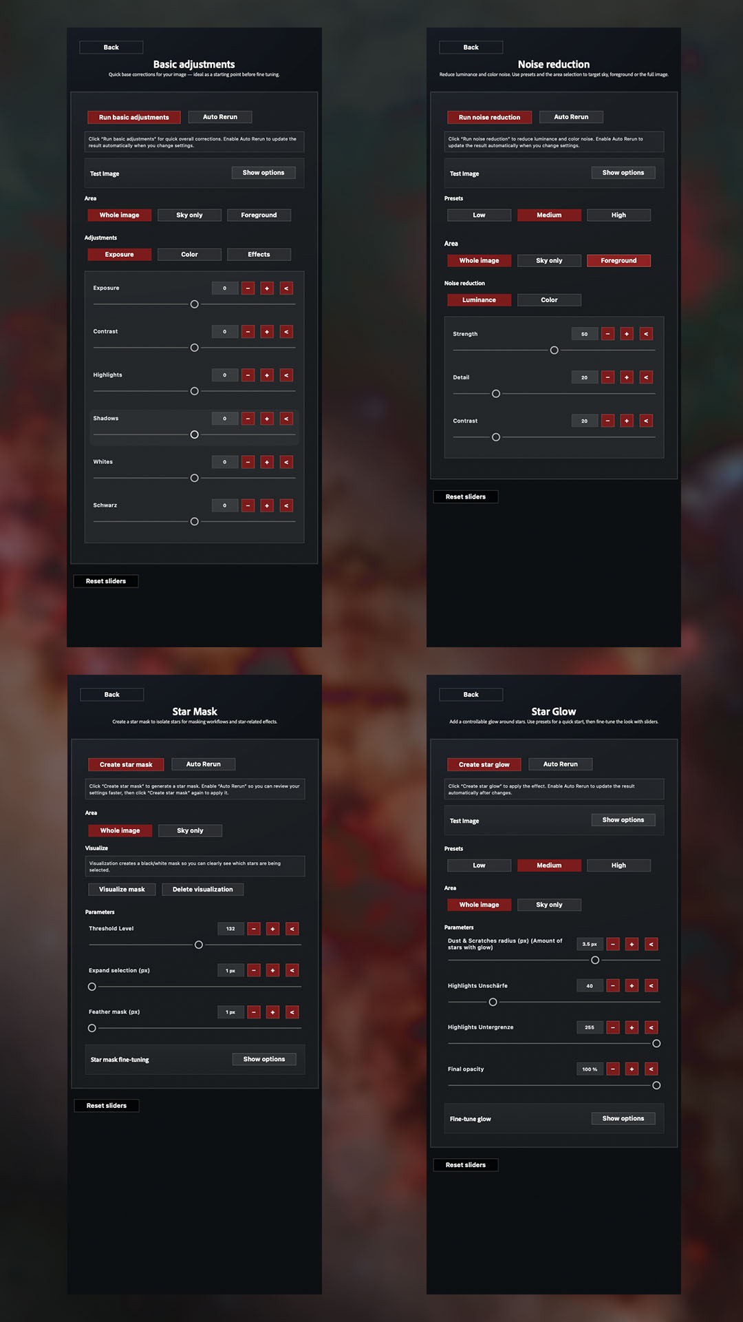 Astro Tools ist ein Photoshop Plugin für Astrofotografie, das deinen Astrofotografie-Workflow in eine übersichtliche Benutzeroberfläche bringt: Presets, Slider, Live Preview, maskenbasierte Anpassungen sowie beliebte Tools wie den Starglow Effekt u.v.m – für konsistente Ergebnisse in weniger Zeit.